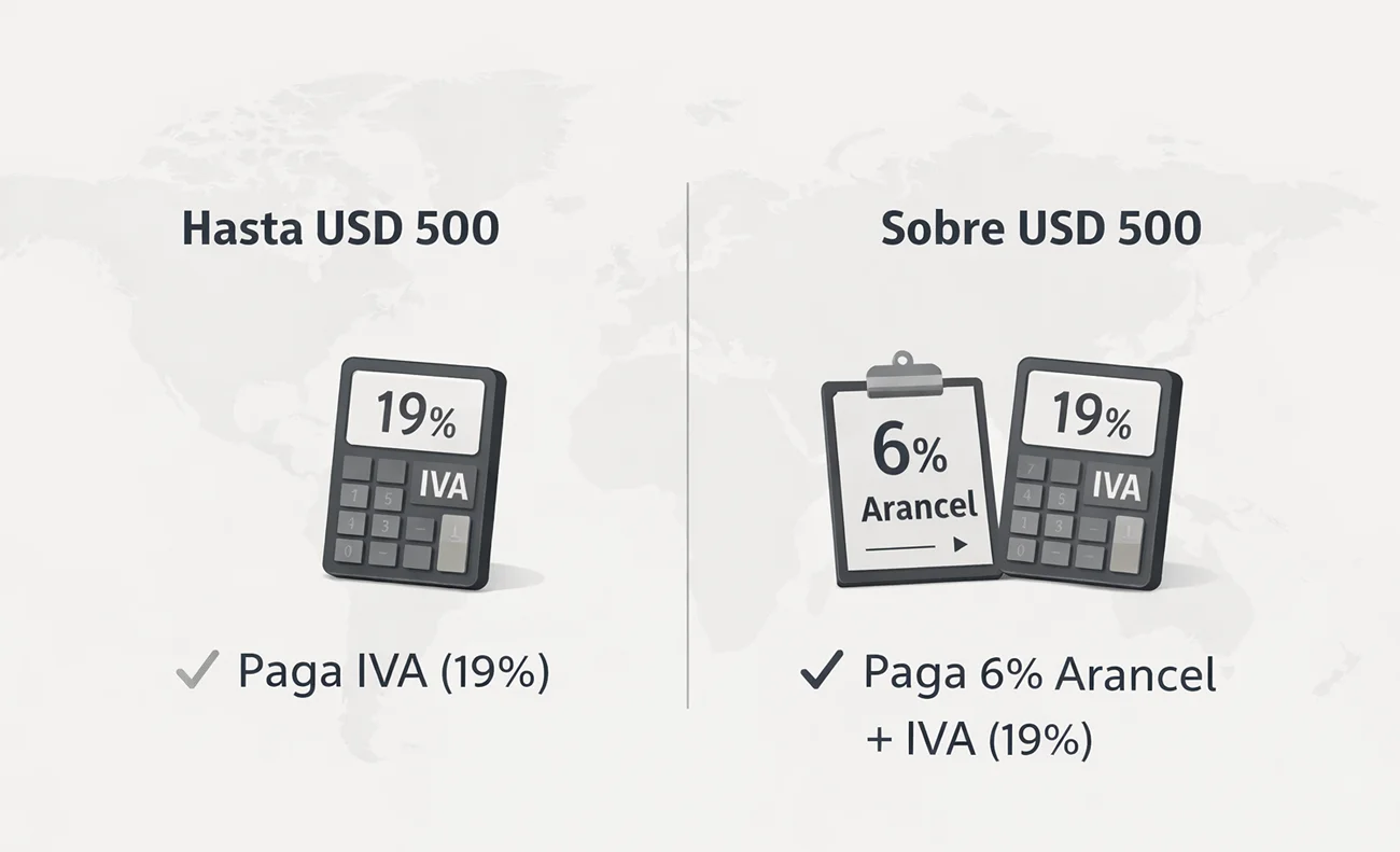 Para compras de hasta USD 500, corresponde el IVA del 19%. Si el pedido supera los USD 500, la compra queda sujeta al régimen general de importación, aplicándose un arancel aduanero del 6% además del IVA del 19%.